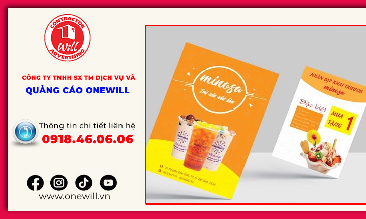 Onewill tự hào là đơn vị thiết kế, in ấn và thi công quảng cáo uy tín tại TP.HCM, mang đến những giải pháp truyền thông sáng tạo – hiệu quả – đẳng cấp. Với đội ngũ thiết kế giàu kinh nghiệm, tư duy thẩm mỹ cao cùng quy trình sản xuất chuyên nghiệp, hãy để Onewill đồng hành cùng bạn trên hành trình xây dựng hình ảnh thương hiệu chuyên nghiệp và khác biệt. Dù bạn cần thiết kế nhận diện, in ấn quảng cáo hay thi công bảng hiệu, Onewill luôn sẵn sàng mang đến giải pháp tối ưu – sáng tạo – bền vững, giúp thương hiệu của bạn tỏa sáng giữa thị trường đầy cạnh tranh.