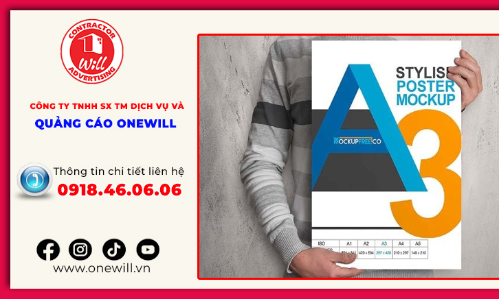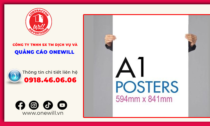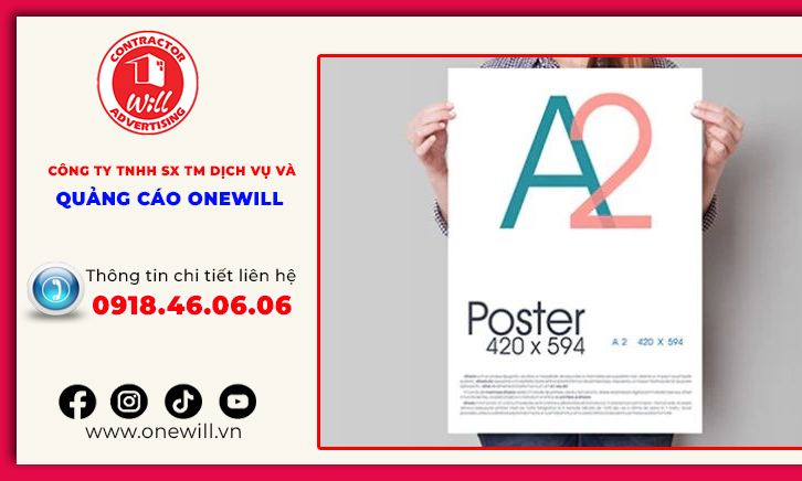 - Poster quảng cáo: B2 (50×70 cm), B1 (70×100 cm), A2 (42×59.4 cm). Dễ nhìn từ xa, phù hợp vị trí treo như tường, cột.