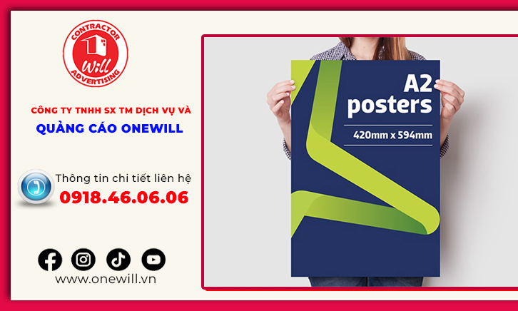 - Poster quảng cáo: B2 (50×70 cm), B1 (70×100 cm), A2 (42×59.4 cm). Dễ nhìn từ xa, phù hợp vị trí treo như tường, cột.